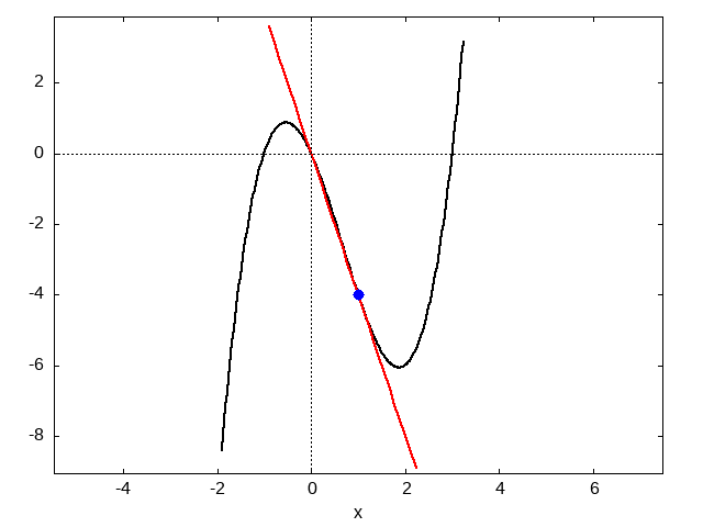 Ermitteln Sie die Gleichung der Tangente an $f$ im Punkt $P(\, 1 \,|\, -4 \,)$.