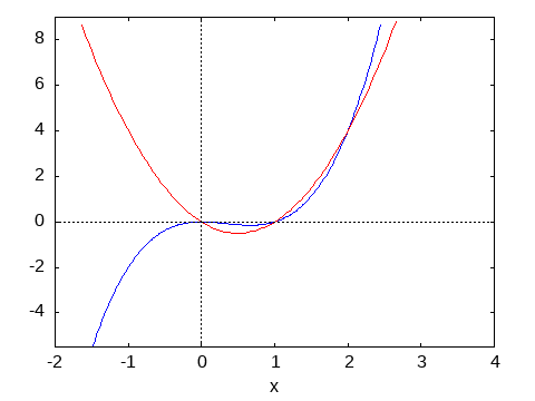 \begin{eqnarray*} f(x) & = & x^3-x^2 \\ g(x) & = & 2\,x^2-2\,x \end{eqnarray*}
