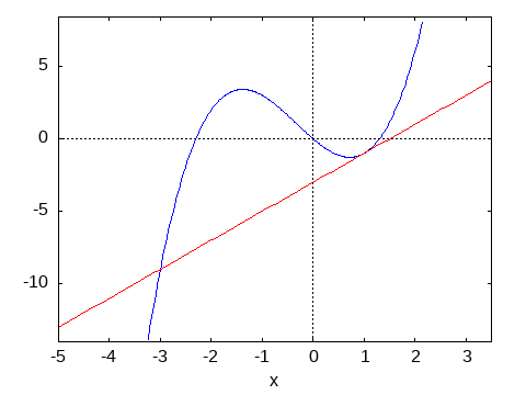 \begin{eqnarray*} f(x) & = & x^3+x^2-3\,x \\ g(x) & = & 2\,x-3 \end{eqnarray*}