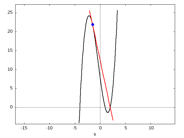 Ermitteln Sie die Gleichung der Tangente an $f$ im Punkt $P(\, -1{,}5 \,|\, 21{,}87 \,)$.