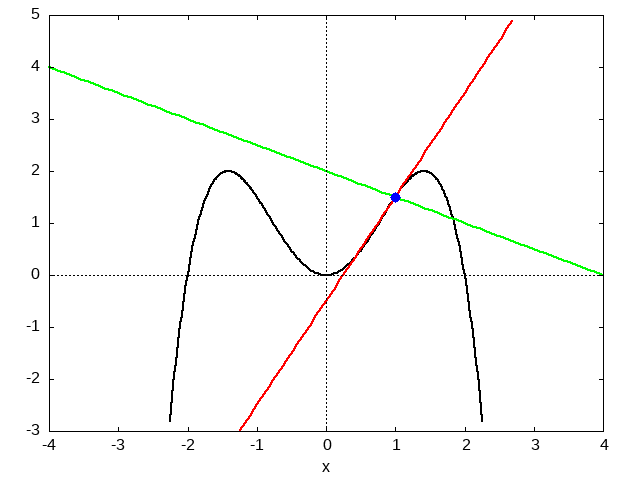 m_N & = & \frac{-1}{m_T} = -0.5 \\[2mm] y_N & = & m_N x + n_N \\ 1.5 & = & (-0.5) \cdot 1
