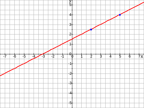 & y & = & m\cdot x + n \\[2mm] P_1:\; & 4 & = & m\cdot 5 + n \\[1mm] P_2:\; & 2{,}5 & = & m\cdot 2 + n \\[1mm]
