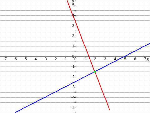 f_1(x) & = & f_2(x) \\ 0{,}5\,x-2{,}5 & = & 3{,}5-2{,}5\,x \quad \mid \dots\\ & \dots & \\[2mm] x_s & = & \underline{ 2 } \\[1mm] y_s & = & f_1( 2 ) = \underline{